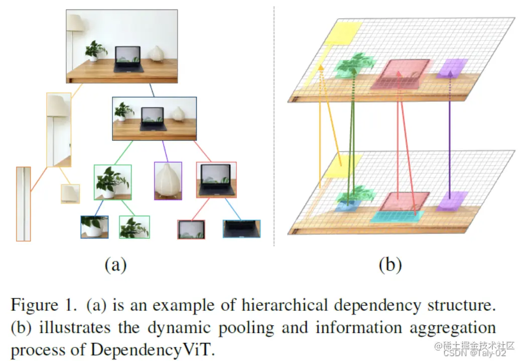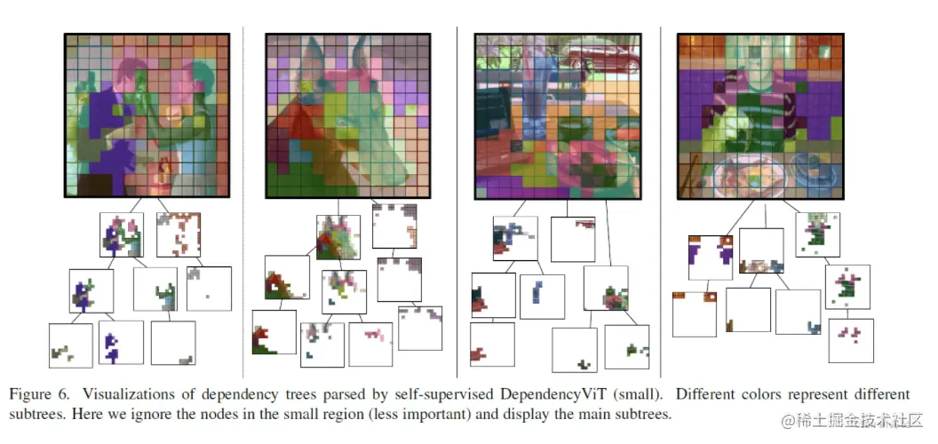 本文回答了上述问题自然提出的一个问题:我们能否有效地获取object dependencies吗?目前,可视化解析的工作主要集中在语义分割和实例分割两方面。与基于检测器的工作依赖于预先训练的检测器不同,它们在像素级上解析图像,这是资源密集型和昂贵的。受视觉变形器[26]的启发,它将图像补丁作为输入,并利用自我注意来执行tokens之间的交互,作者提出在tokens级别上构建一个描述依赖性的tree。将补丁作为基本元素并基于它们构建树结构有两个好处:1)它统一了部分级和对象级的依赖关系,所有这些依赖关系都被表述为子树;2)在dependencies结构中,信息可以从叶子聚合到父结点(如图所示),从而产生路径上不同部分和对象的表示层次结构。