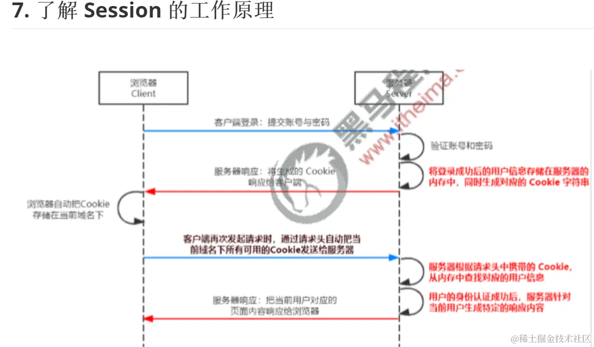 客户端第一次请求服务器的时候,服务器通过响应头的形式,向客户端发送一个身份认证的Cookie,客户端会自动 将 Cookie 保存在浏览器中。随后,当客户端浏览器每次请求服务器的时候,浏览器会自动将身份认证相关的Cookie,通过请求头的形式发送给 服务器,服务器即可验明客户端的身份。