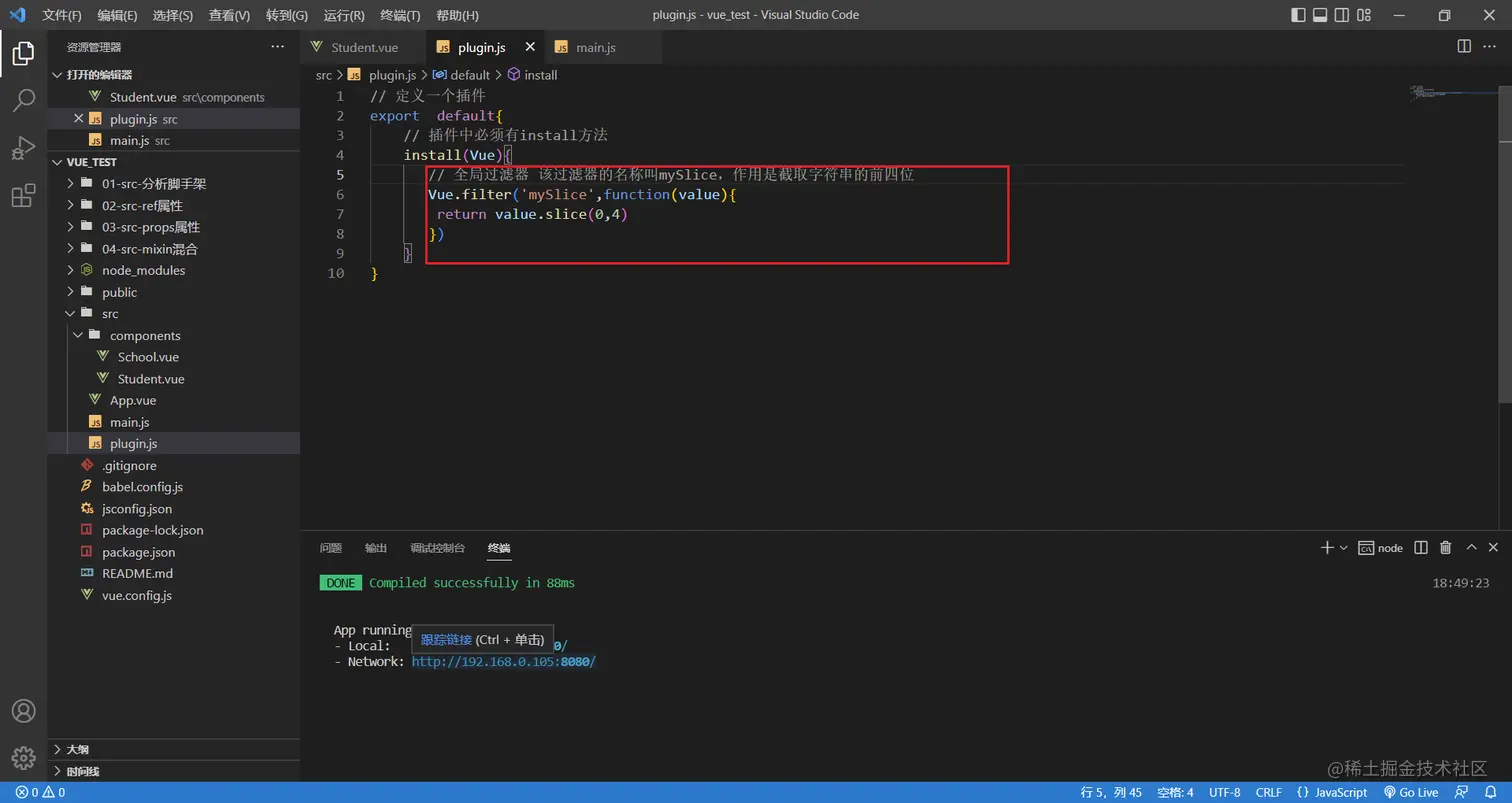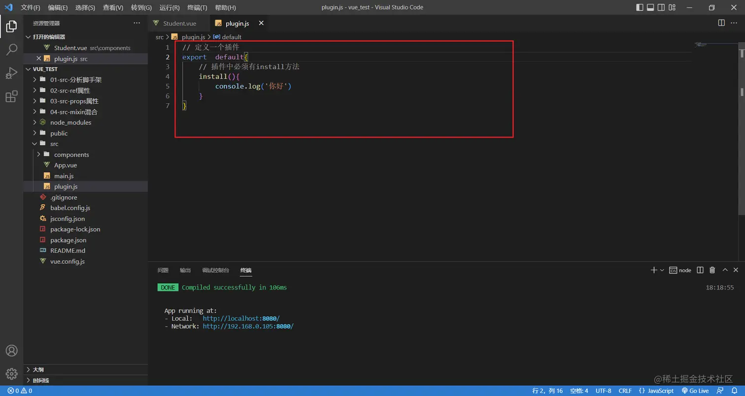 新建一个plugin.js文件,里面必须有install方法,先简单做一个输出