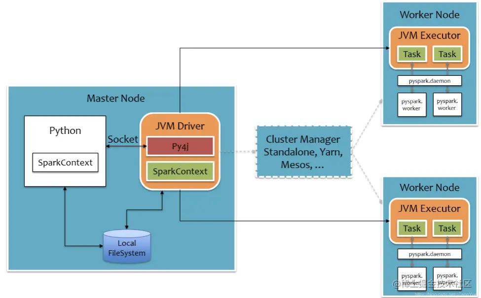 PySpark宗旨是在不破坏Spark已有的运行时架构,在Spark架构外层包装一层Python API,借助Py4j实现Python和Java的交互,进而实现通过Python编写Spark应用程序