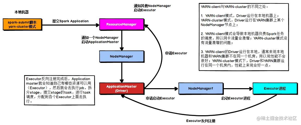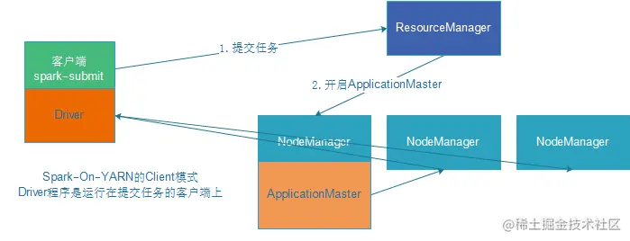 1)Driver在任务提交的本地机器上运行,Driver启动后会和ResourceManager通讯申请启动ApplicationMaster;