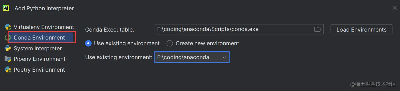 点击Add Interpreter,选择Conda Interpreter: