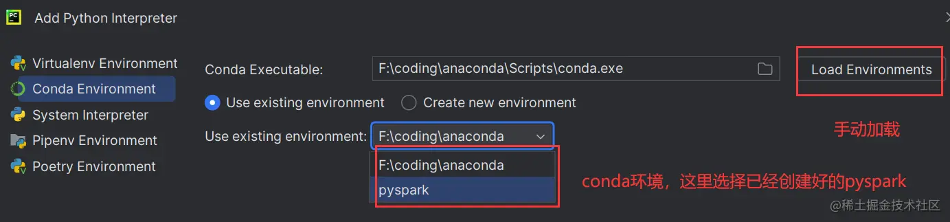 然后会自动加载conda中已经创建好的环境,如果没有的话可以选择右上角的Load Environments手动加载;