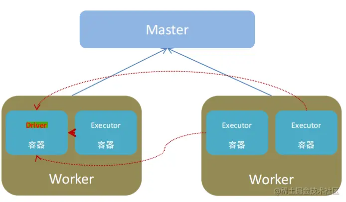 3.该模式下Driver运行ApplicattionMaster这个节点上,由Yarn管理,如果出现问题,yarn会重启ApplicattionMaster(Driver)