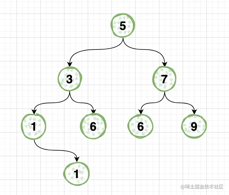curEnd为节点5,节点5进入队列,也就是节点入队之前标记curEnd 节点5从队列里弹出,当前层节点数+1节点3进入队列,nextEnd标记为节点3节点7进入队列,nextEnd标记为节点7- 当前操作节点