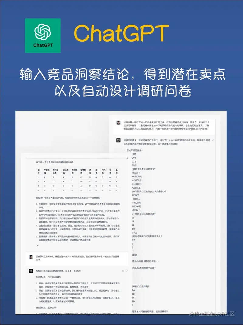 - 卖点挖掘:使用ChatGPT,将竞品分析结果分享给GPT,让其提出潜在卖点并设计调研问卷。