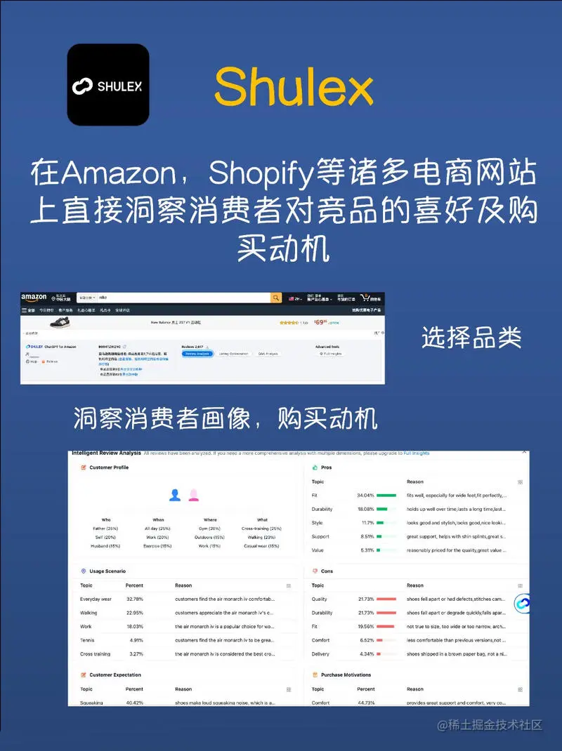 - 竞品分析:借助Shulex,在Amazon和Shopify上找到相同品类的SKU,一键分析商品优缺点及用户购买动机。