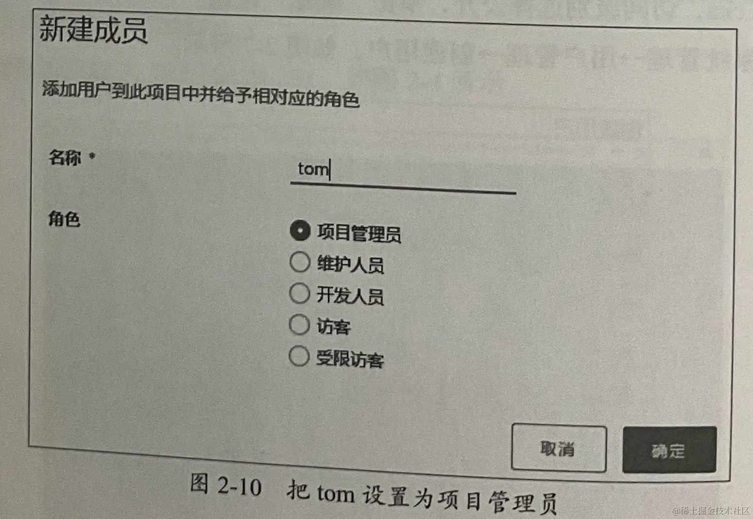 名称里输入tom,角色选择项目管理员,单击“确定”按钮。