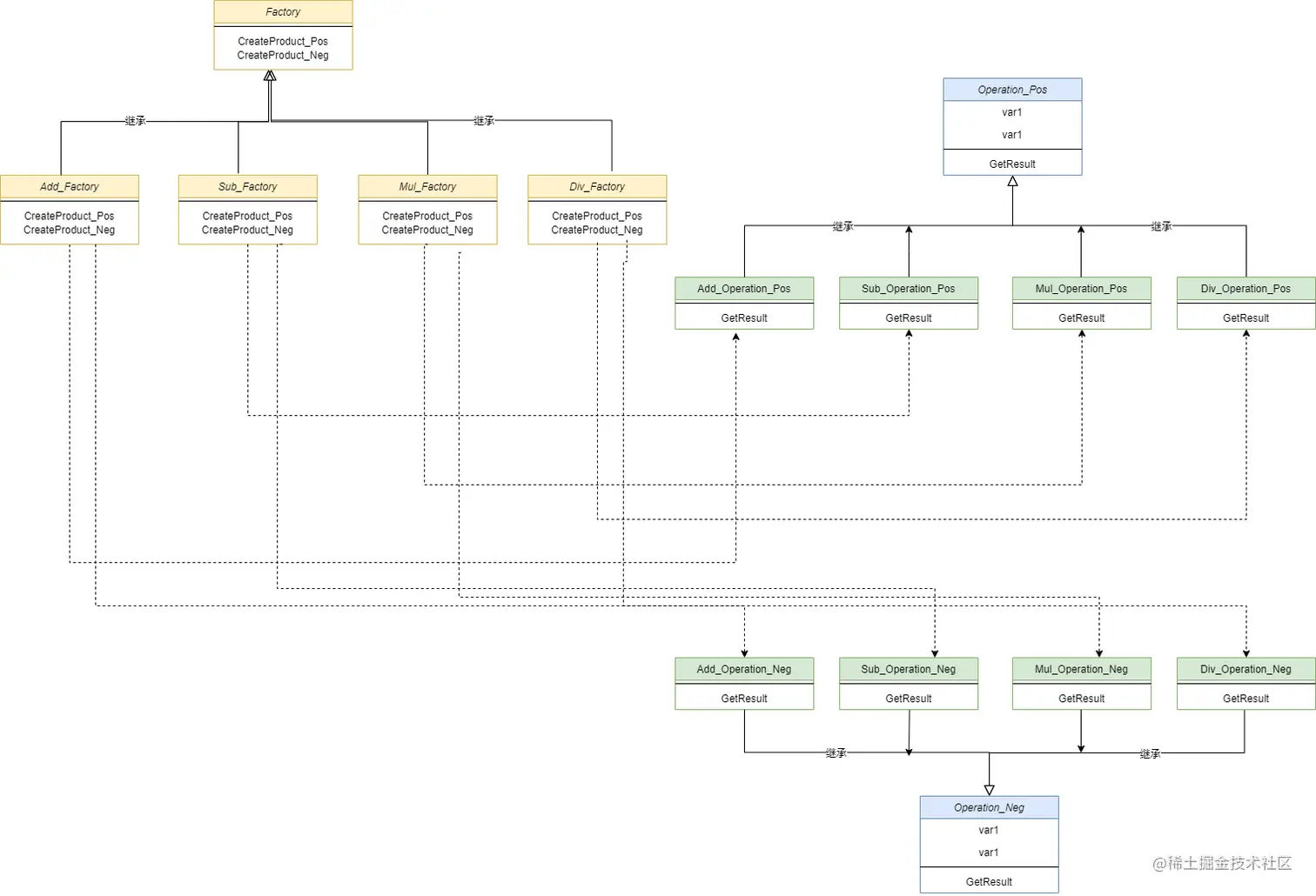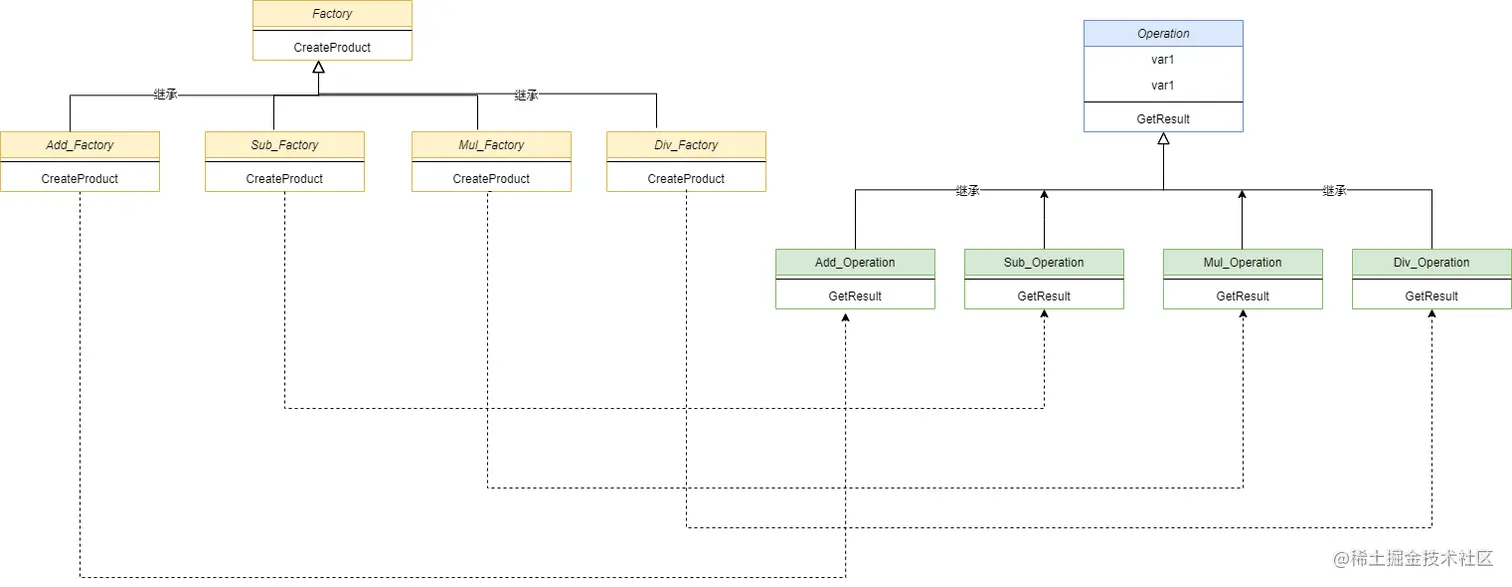 - 抽象工厂 在工厂方法的基础上,可能有多个产品,可以在工厂基类里声明多个虚函数。每个工厂实现类,都需要实现能生产多个类别的产品。