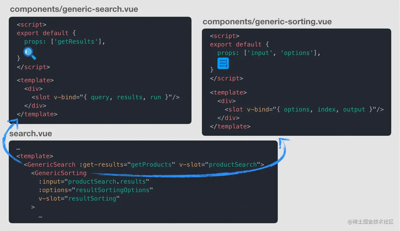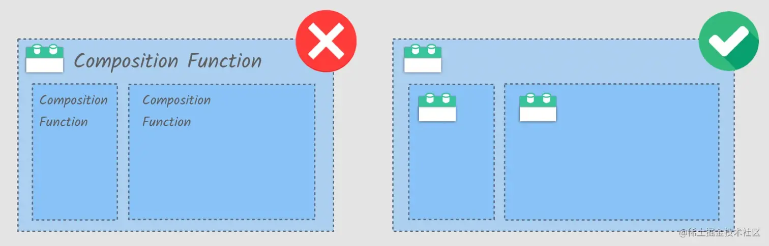 - 由于它们只是函数,所以比 Mixins 和作用域插槽更灵活。