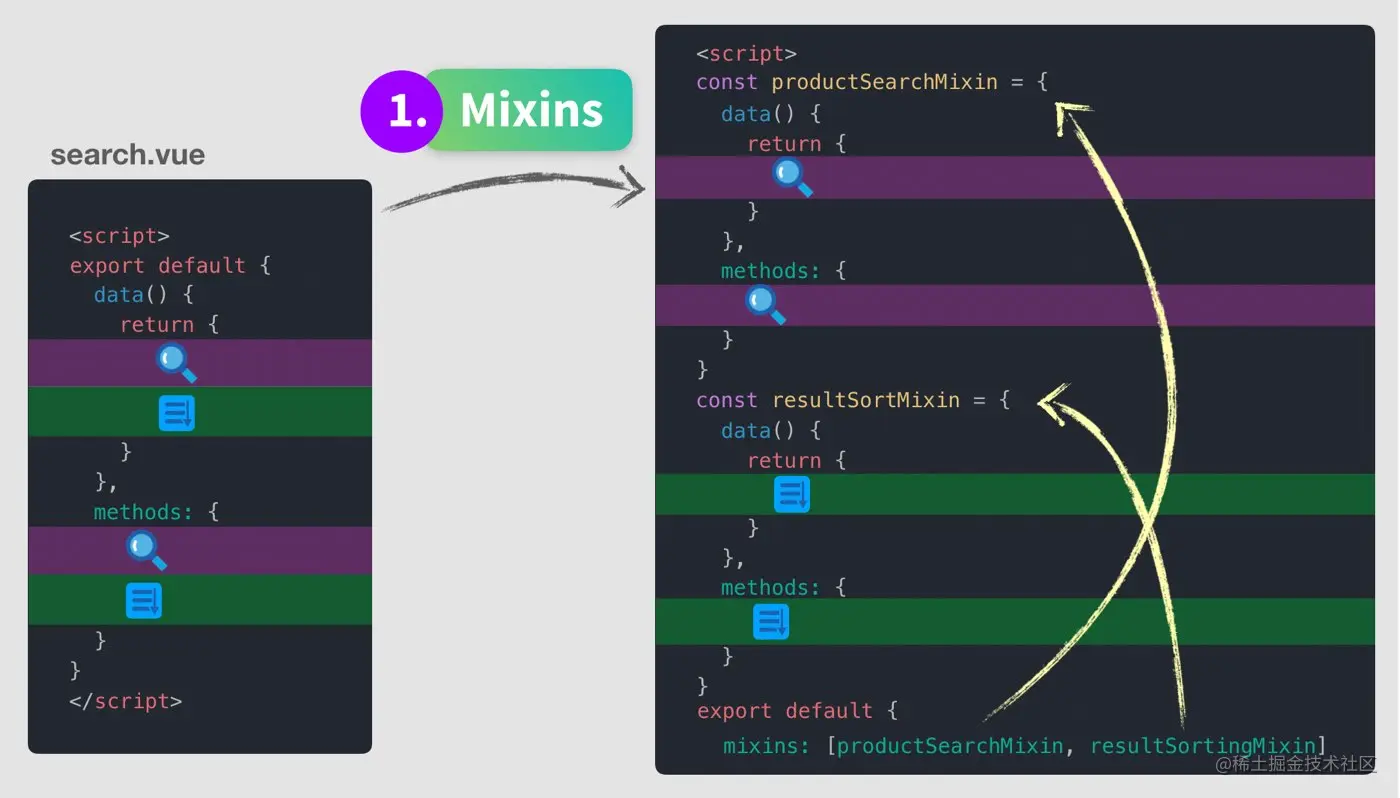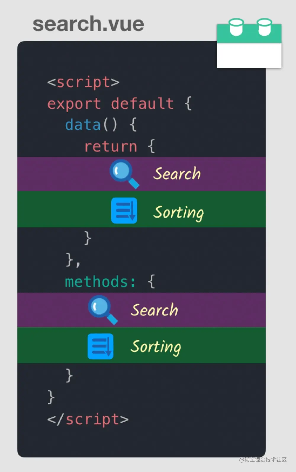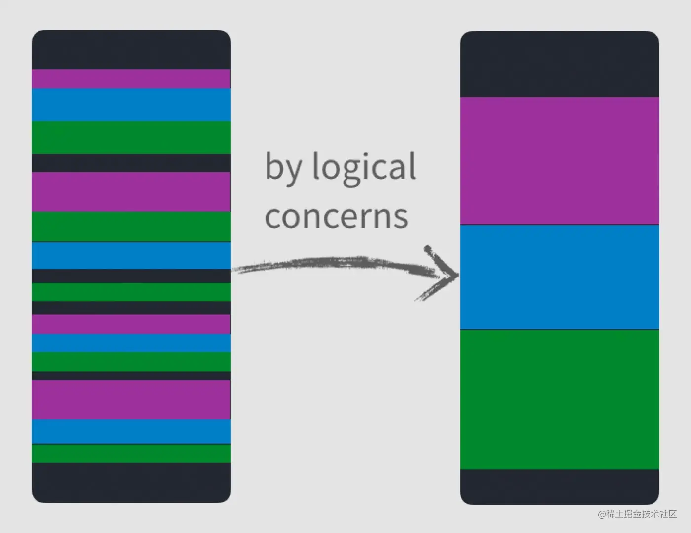 到目前感觉还不错,但当我们想向同一组件添加搜索过滤器和分页功能时,问题就出现了。这些新功能会被拆分成代码片段分布在组件的选项中(components, props, data, computed, methods,生命周期钩子)。如果我们使用颜色(如下左图)将其可视化,会发现非常分散,从而使我们的组件更难以阅读,很难解析哪些代码与哪些功能相关。