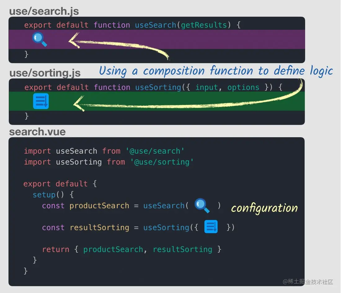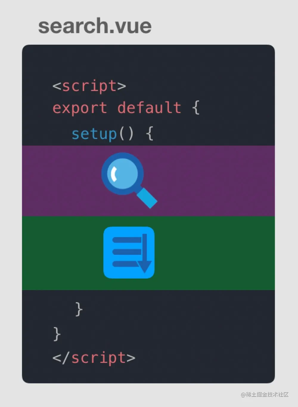 而从逻辑上讲,其分布应该像图后半部分才合理(右图),如果我们可以将我们的功能代码放在一起,我们的代码将更具可读性,从而更易于维护。如果我们使用composition API 进行编写,它会是这样的: