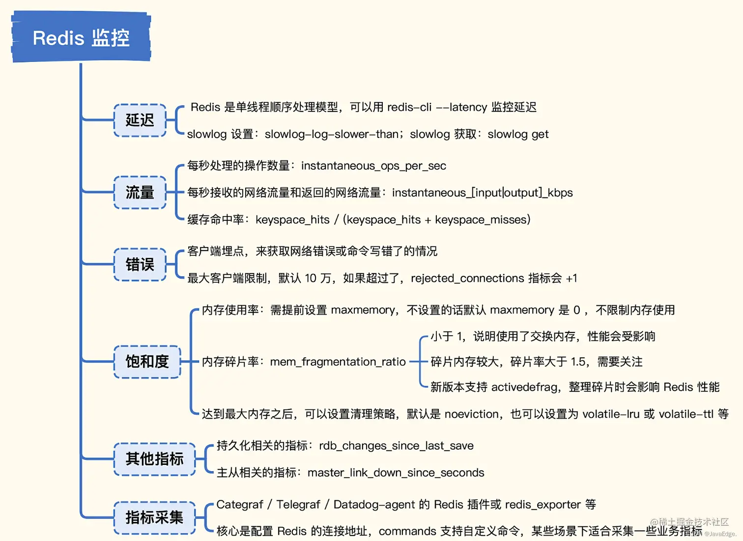 Redis也是对外服务,所以Google四个黄金指标同样适用,还从延迟、流量、错误、饱和度分析Redis关键指标。