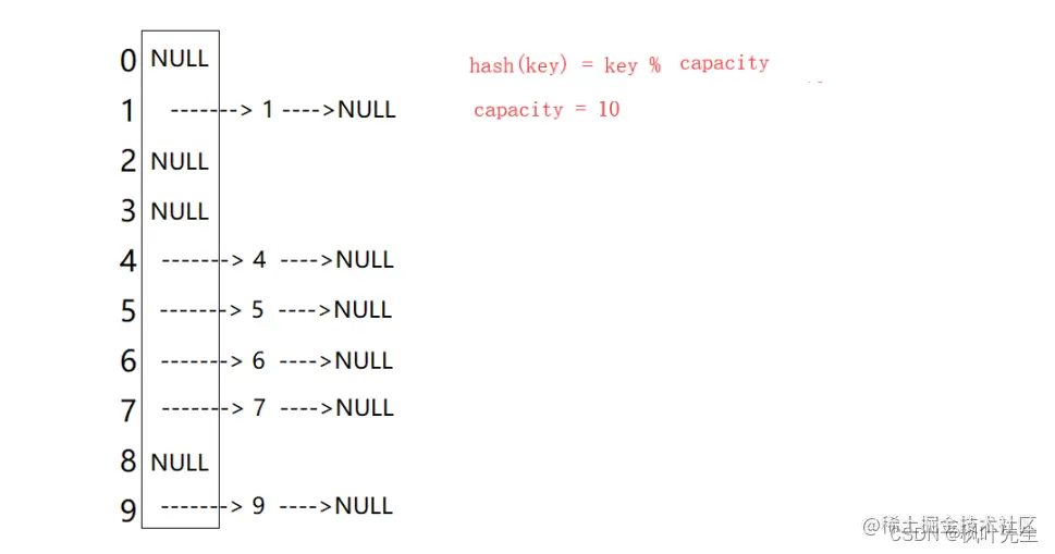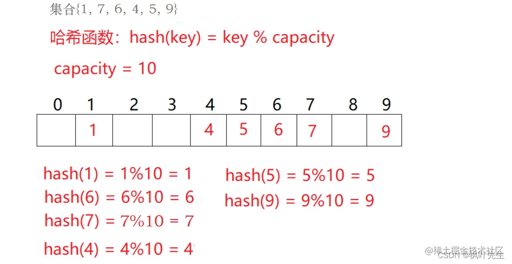 哈希函数设置为:hash(key) = key % capacity; capacity为存储元素底层空间总的大小