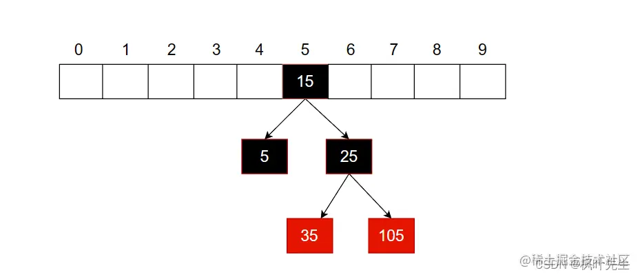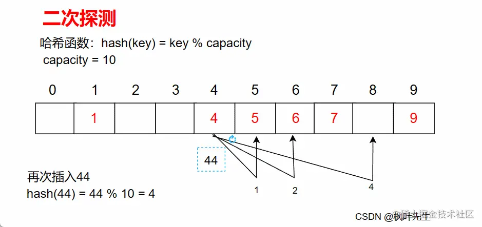 再次插入元素44,发生哈希冲突(采用线性探测)