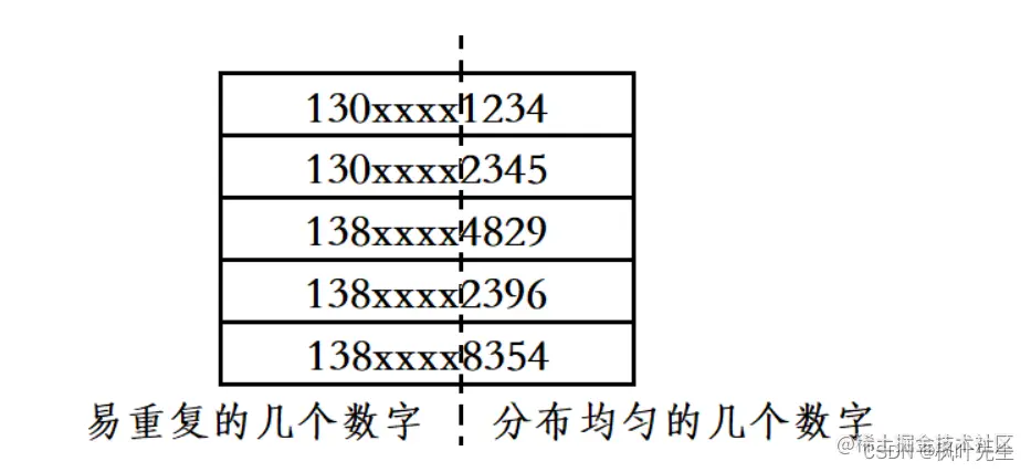 假设要存储某家公司员工登记表,如果用手机号作为关键字,那么极有可能前7位都是 相同的,那么我们可以选择后面的四位作为散列地址,如果这样的抽取工作还容易出现 冲突,还可以对抽取出来的数字进行反转(如1234改成4321)、右环位移(如1234改成4123)、左环移