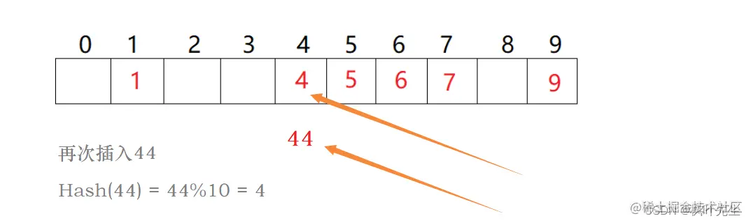 比如上述场景,插入元素44,先通过哈希函数计算哈希地址,哈希地址为4,因此44理论上应该插在哈希地址为4位置,但是该位置已经放了值为4的元素,即发生哈希冲突