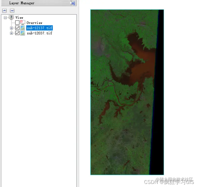 我们先来看一下本文需要实现的需求。现有以下两景遥感影像,其中一景含有地理参考信息,而另一景则不含有任何地理参考信息。在ENVI软件中打开二者,可以看到其是重合在一起的,如下图所示。
