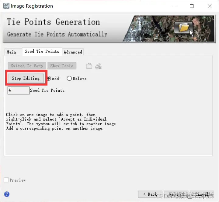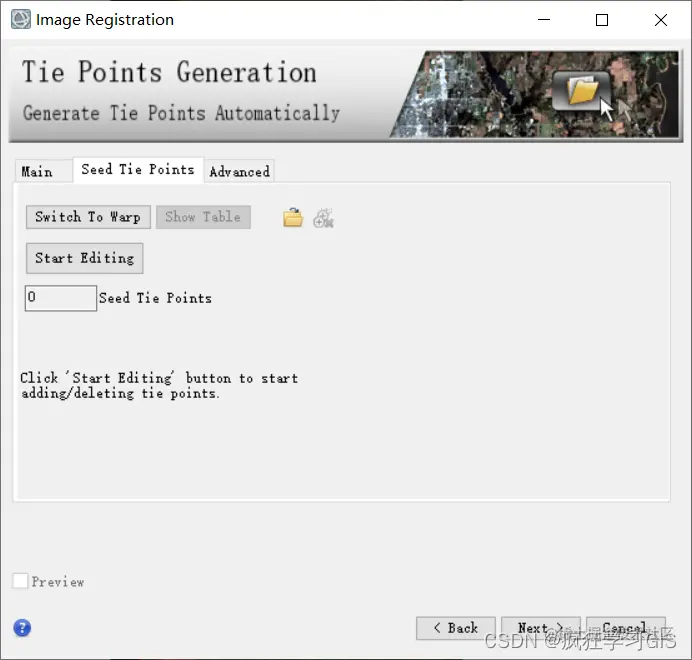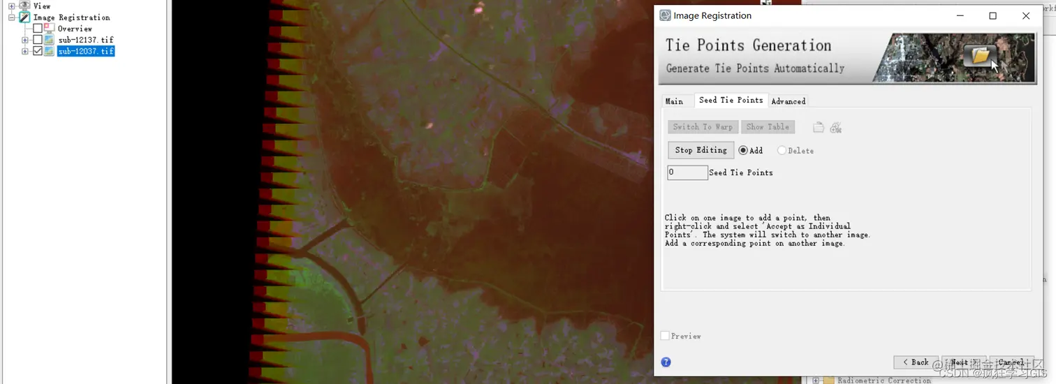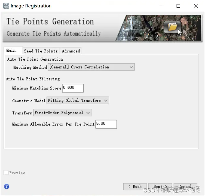 我们需要着重设置的参数,是“Seed Tie Points”页面中的相关内容。这里需要注意,首先,如果大家待配准的两景遥感影像和本文中一样,即一景带有地理参考信息,而另一景不带有地理参考信息的话,就需要先手动选择至少3个地面控制点(这三个点就叫做“种子点”),随后软件将自动生成剩余的地面控制点。其次,如果大家待配准的两景遥感影像都含有地理参考信息,但是二者的空间差距比较大(比如其中一景空间拉伸严重),也需要先手动选择几个地面控制点作为种子点,随后软件将自动生成剩余的地面控制点;这样子可以提高地理配准的精度。此外的其他情况(即待配准的两景遥感影像均含有地理参考信息且空间差异不大),那么就可以不生成任何种子点,直接进入下一步。