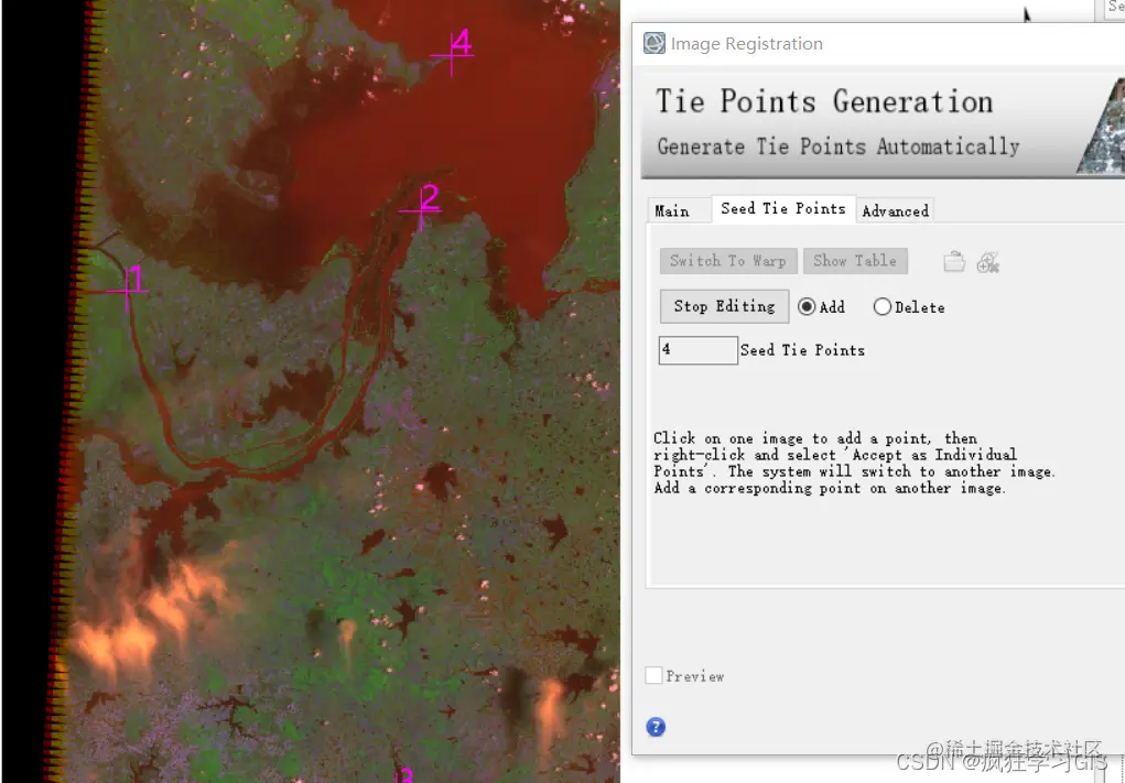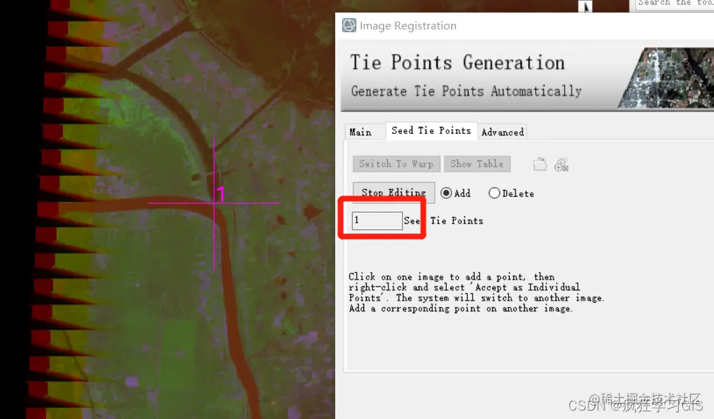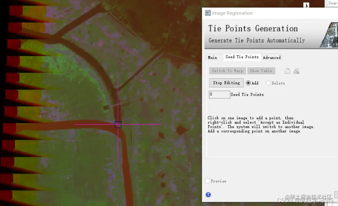 我们前面也提到了,本文的待配准图像一景带有地理参考信息,而另一景不带有地理参考信息,因此软件也会自动提醒我们,至少要先选择3个种子点。