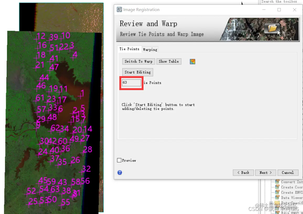没有问题后,点击“Next”,进入“Review and Warp”面板。此时可以看到,系统已经通过我们刚刚选择好的4个种子点,自动生成了59个新的地面控制点。