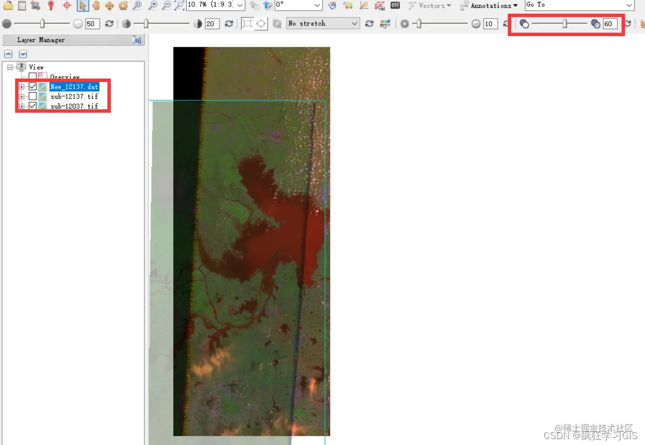导出完毕后,我们查看一下“Base Image File”中填入的标准图像与地理配准后得到的结果图像。通过调整右上角的透明度选项,我们可以看到两景遥感影像的相对位置已经是正确的,即地理配准完成。
