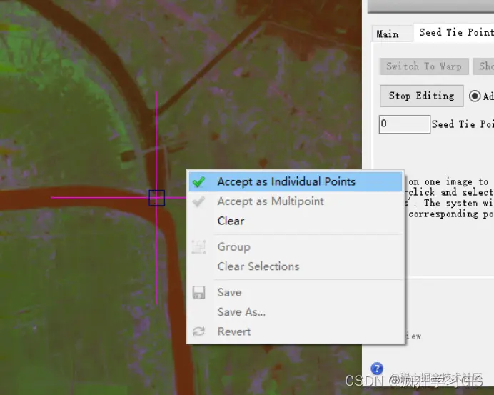 接下来,软件将自动跳转显示“Warp Image File”中输入的图像。我们在该图像中找到前述具有代表性地物在这张图上的点,并同样右键选择“Accept as Individual Points”。