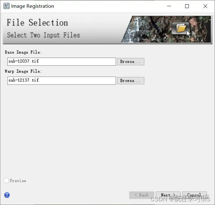 弹出如下所示的“Image Registration”窗口。首先,是“File Selection”面板;其中,我们在第一个选项“Base Image File”中填入标准图像(在本文中就是那一景具有地理参考信息的图像),在第二个选项“Warp Image File”中填入待配准图像(在本文中就是那一景不含地理参考信息的图像)。