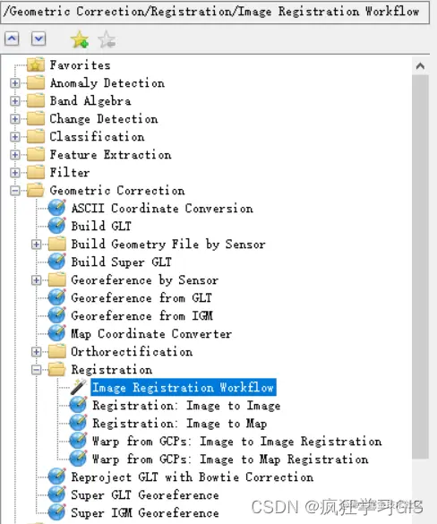 明确了具体需求,接下来就可以开始地理配准操作。首先,我们在ENVI软件中打开对应的两景遥感影像;接下来,在ENVI的工具箱中,依次选择“Geometric Correction”→“Registration”→“Image Registration Workflow”。