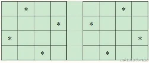 例如:4 * 4的矩阵方格,4个棋子,有2种放置方案