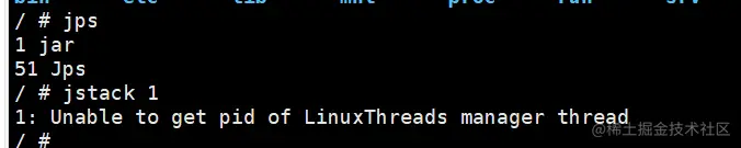 在以openjdk:8-jdk-alpine为镜像基础打包生成的应用中,进入容器内,执行jstack命令时出现Unable to get pid of LinuxThreads manager thread 的错误。