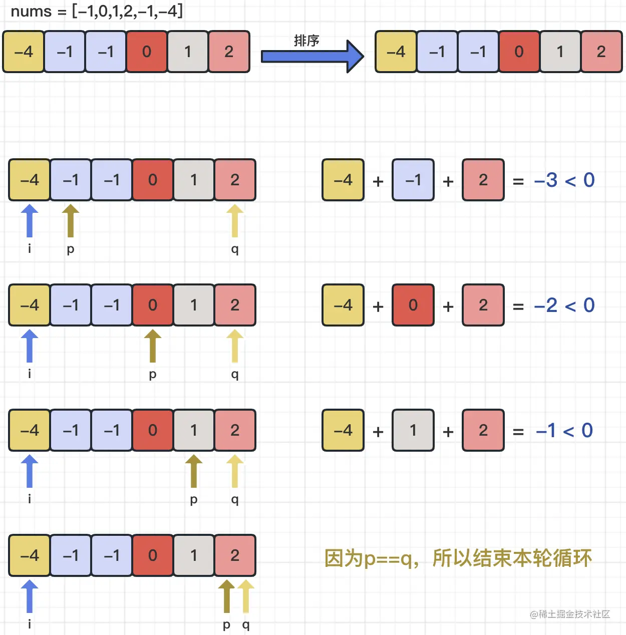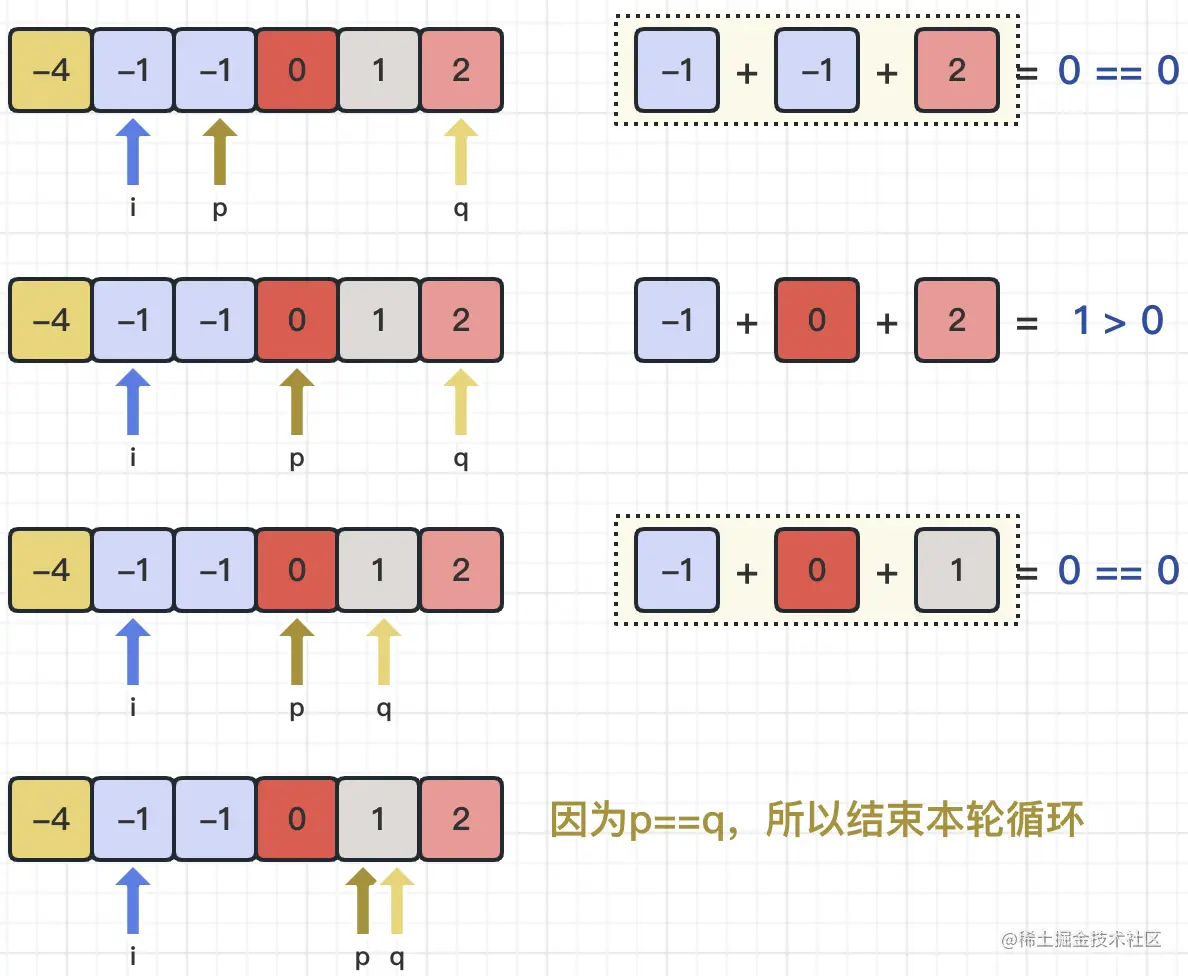 除了上面的逻辑,我们还需要注意去重的操作,也就是说,当我们移动i指针、p指针或q指针的时候,如果发现待移动的位置数字与当前数字相同,那么就跳过去继续指向下一个元素,直到找到与当前数字不同的数字为止(当然,要避免数组越界)。在移动p指针和q指针的过程中,如果不满足p<q,则结束本轮操作即可。