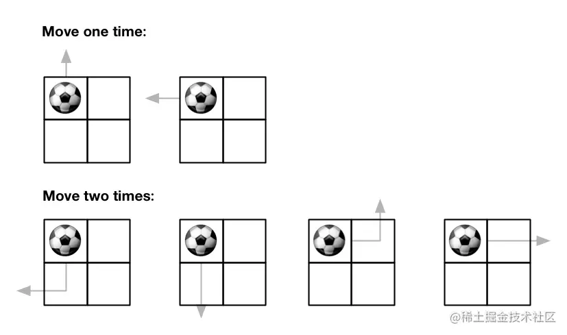 输入: m = 2, n = 2, maxMove = 2, startRow = 0, startColumn = 0