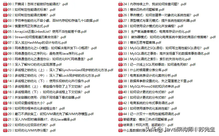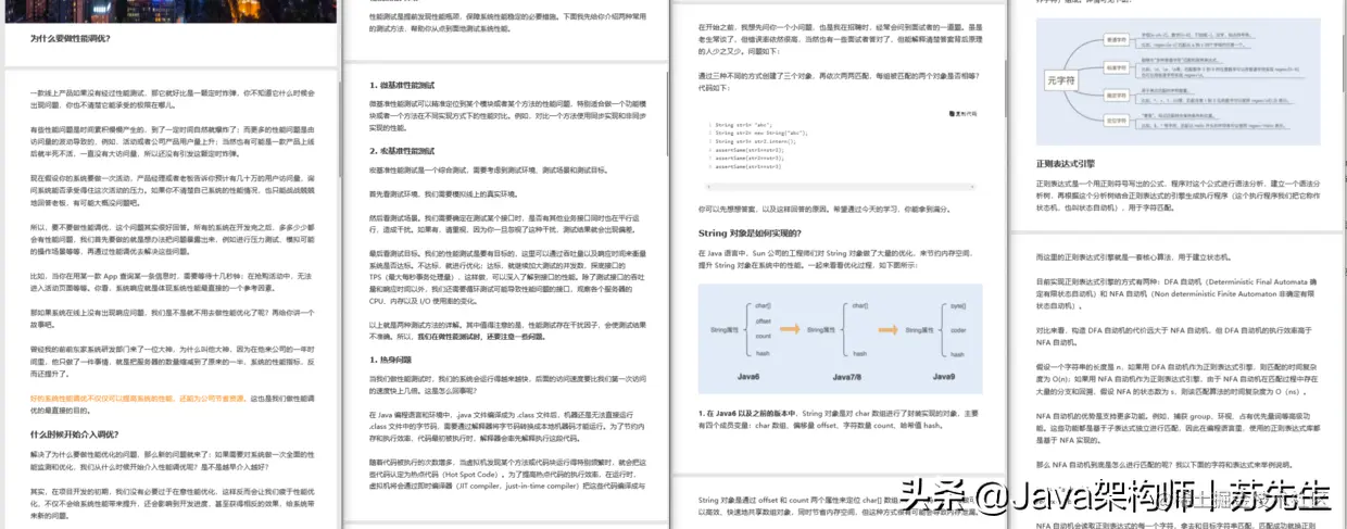 因此,在本文中,小编收集整理的这些Java性能笔记,从Java应用服务的每一层优化实战出发,精选高频性能问题,透过Java底层源码,提炼出优化思路和它背后的实现原理,最后形成一套"学完就能用的调优方法论", 帮助你快速进阶。
