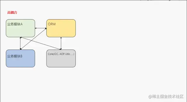 逻辑单元之间存在依赖, 导致改动可能会互相影响, 关系越紧密, 耦合越强,逻辑单元独立性越差。