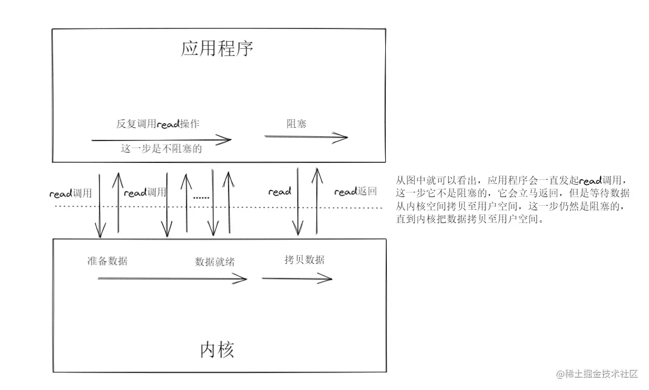 但是从图中也能看出问题所在,就是应用程序不断的进行IO系统调用轮询数据是否已经准备就绪的这段时间,是十分消耗CPU资源的(说白话就是反复调用read操作) 。