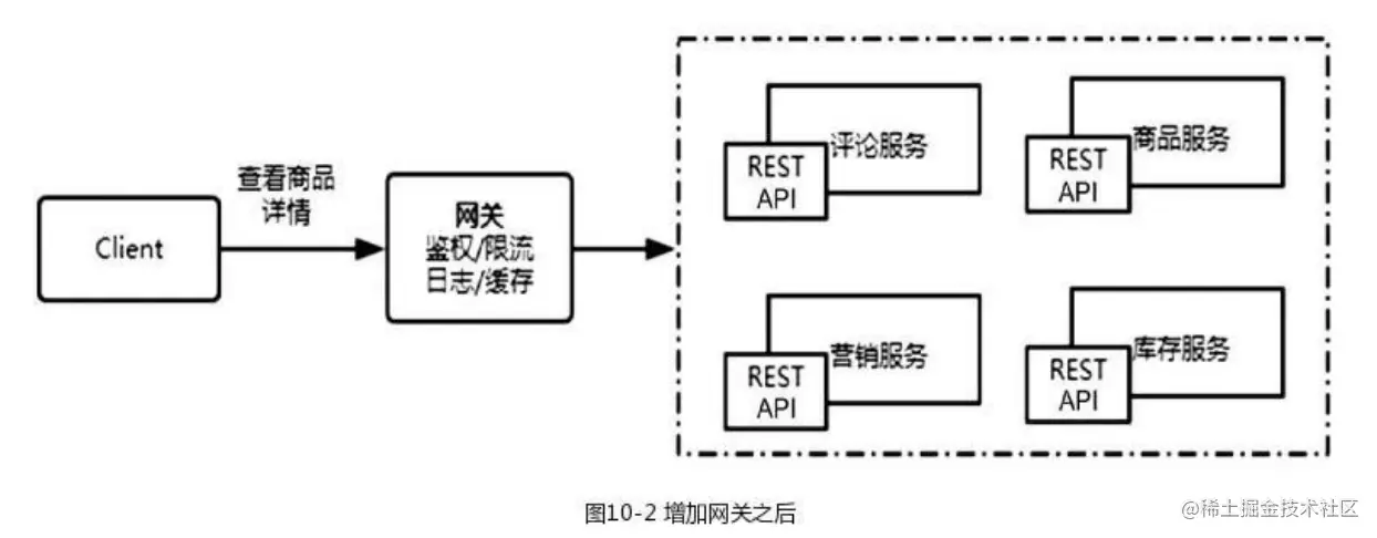 Client端与Server端新增一个API网关。API网关相当于门面,所有的外部请求先经过网关层。