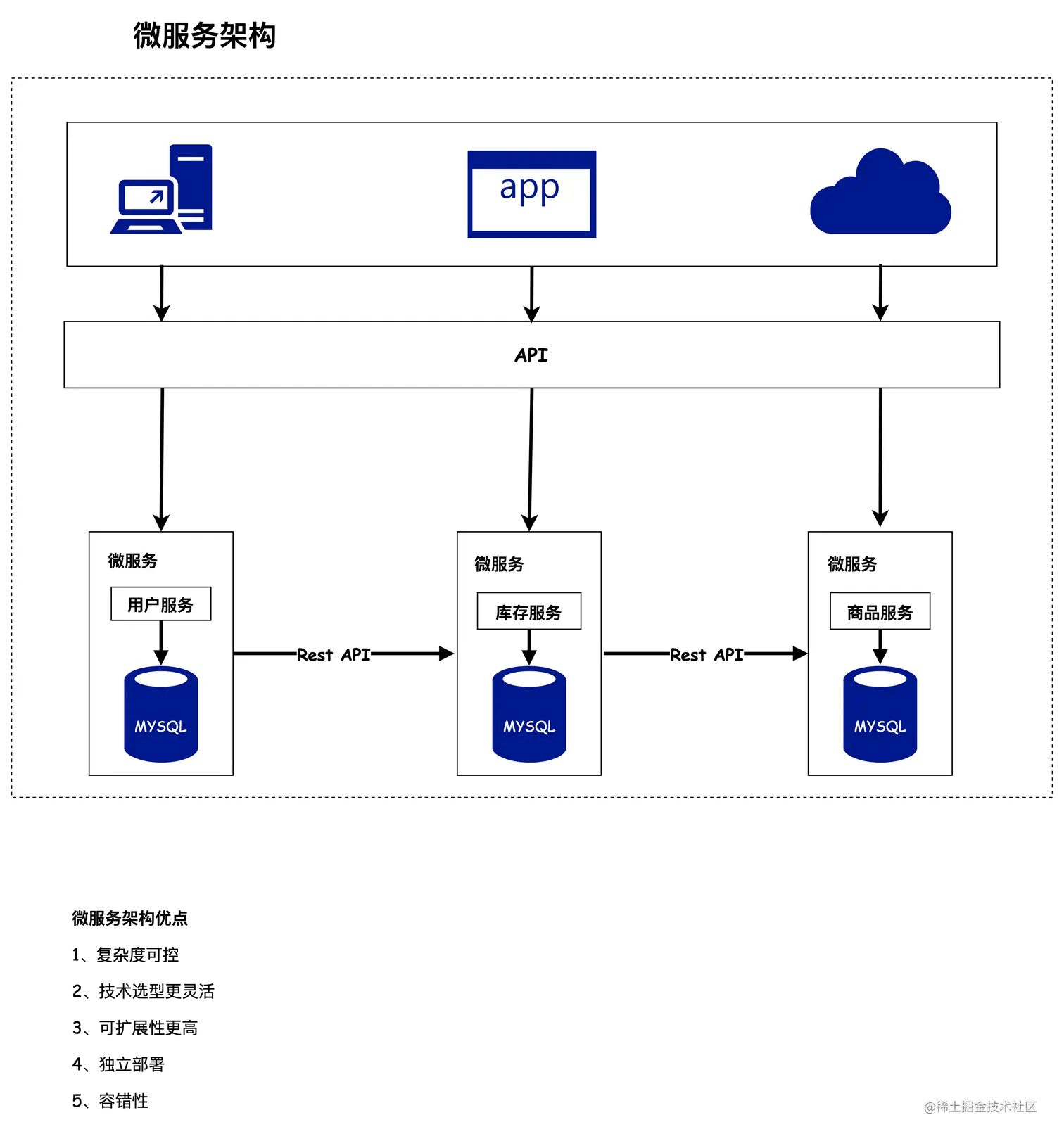 在微服务架构中,每个微服务都是相对于独立开发和运行的组件。而一个完整的微服务架构由一系列的独立运行的微服务组成。而每个微服务之间通过轻量级的通信机制RUST API或RPC完成通信。