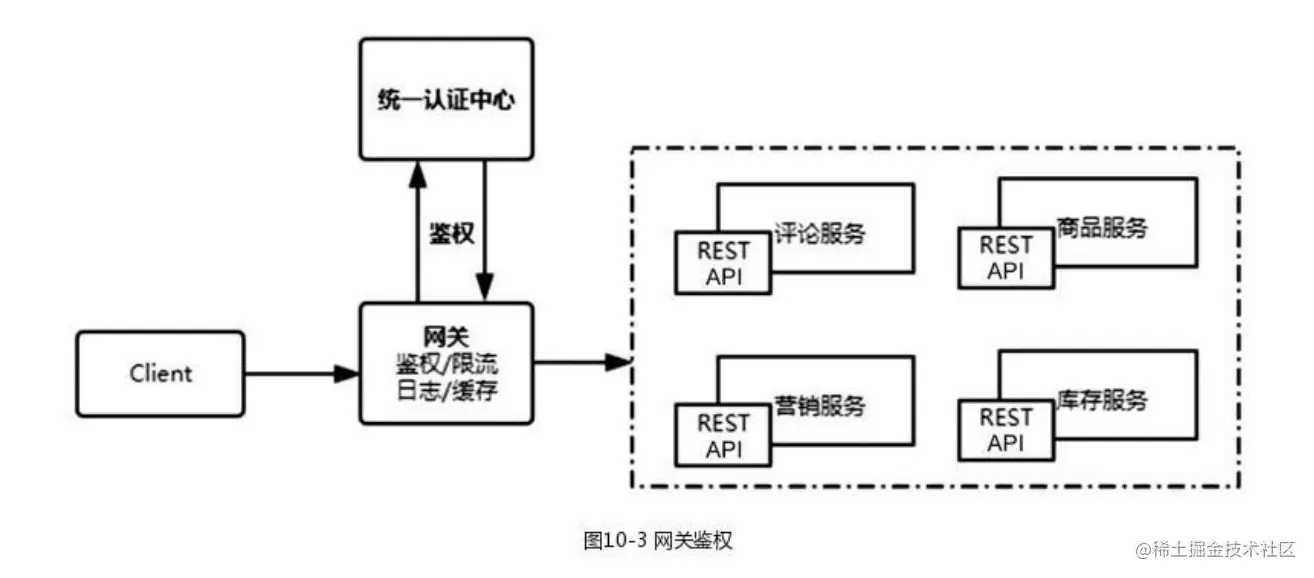 - 服务端的鉴权会分布在每个微服务中处理,客户端对于每个服务的调用需要重复鉴权。(每个微服务都会做重复的事情)