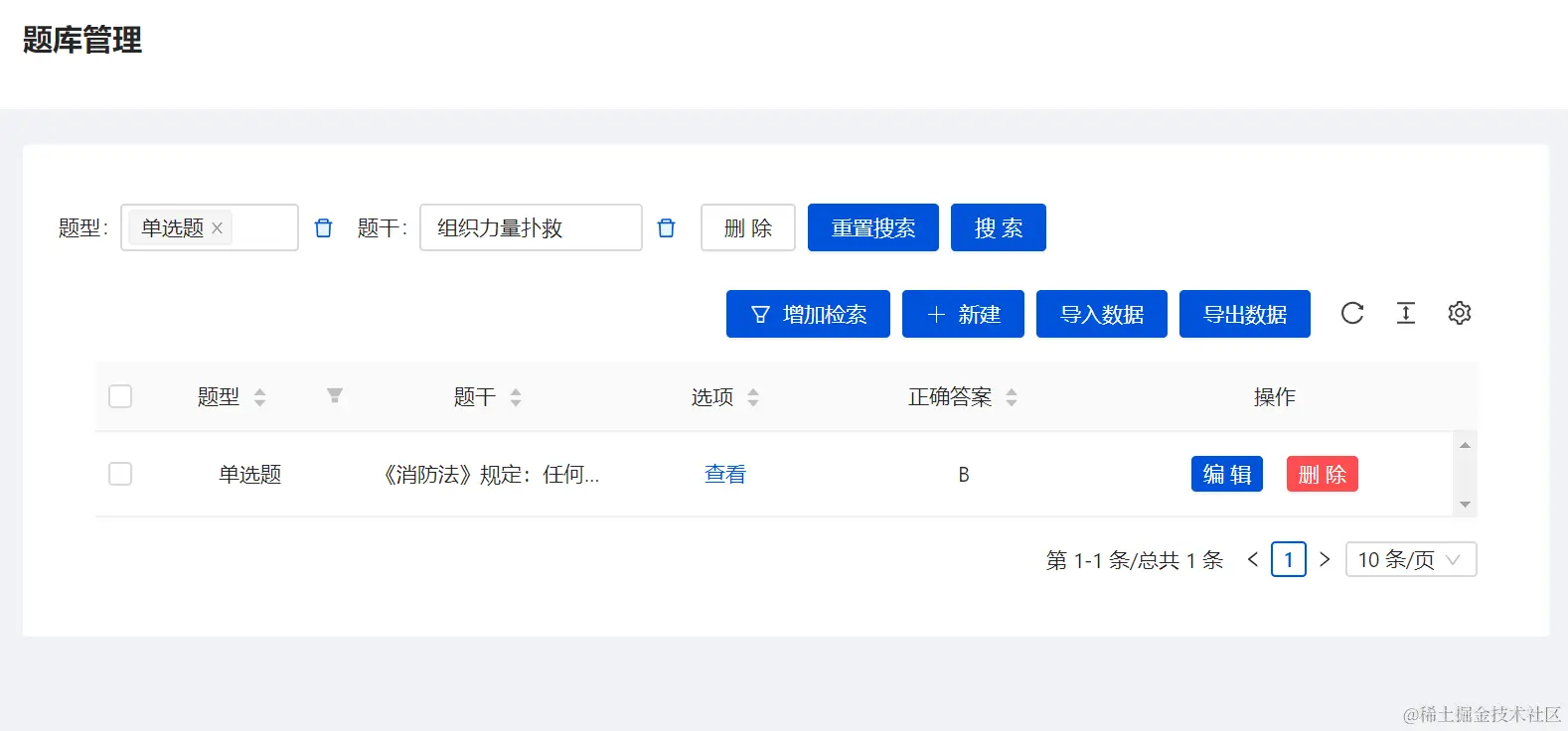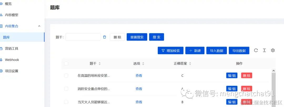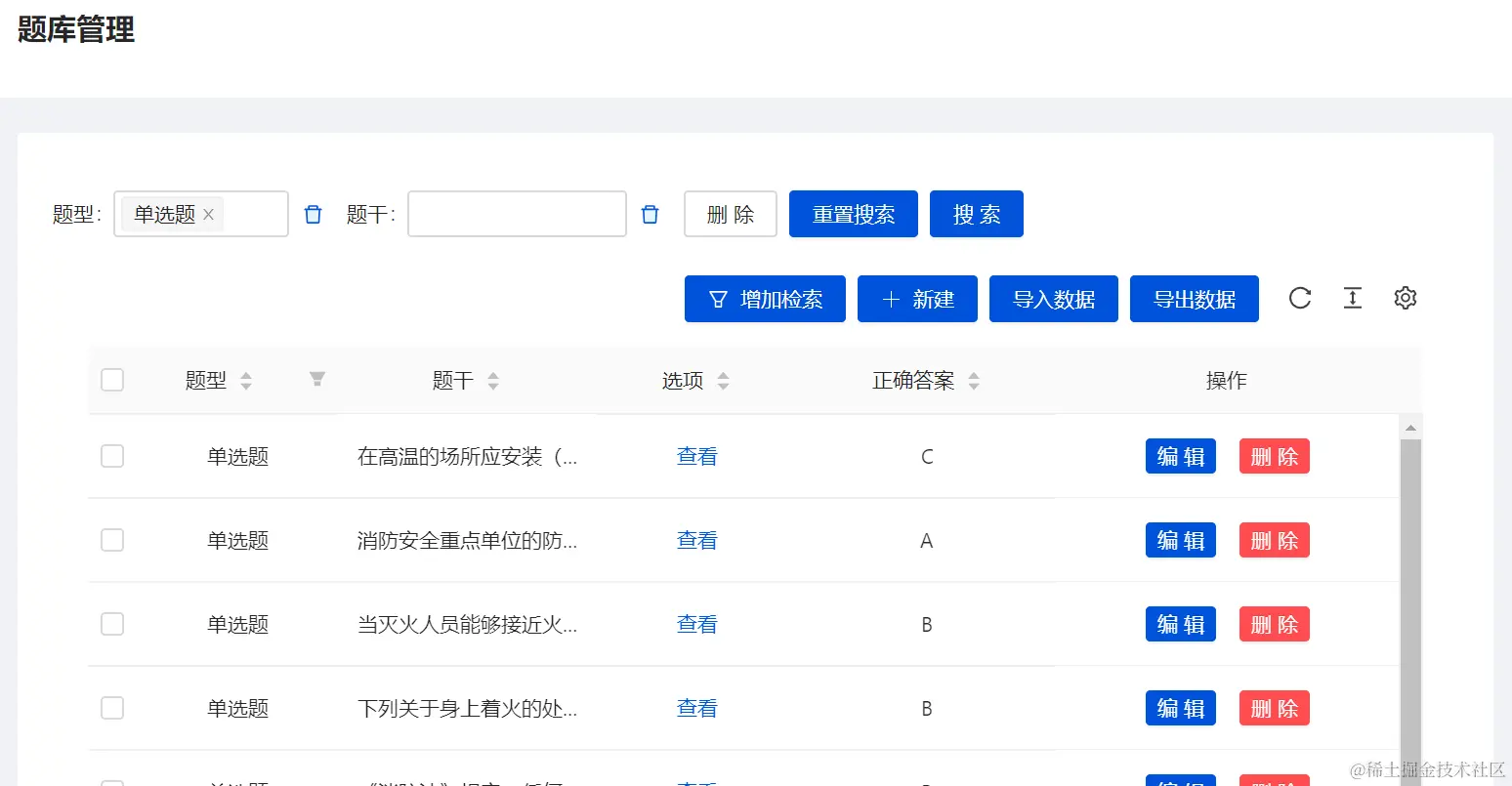 在题库内容列表页,我们可以对已有的题库内容进行管理,如编辑、删除题目,导入新的题目数据等。