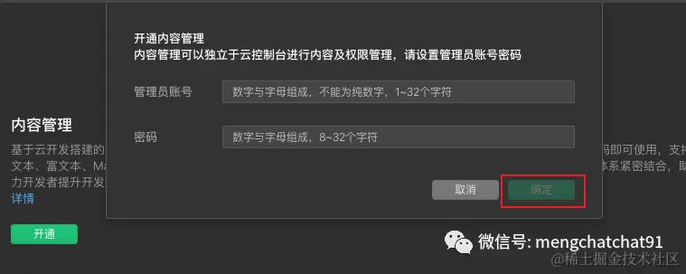 3、账号密码。填写管理员账号及密码用于登录内容管理服务平台,点击「确定」完成开通。