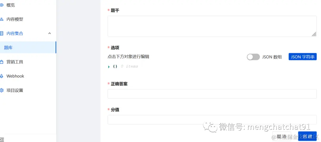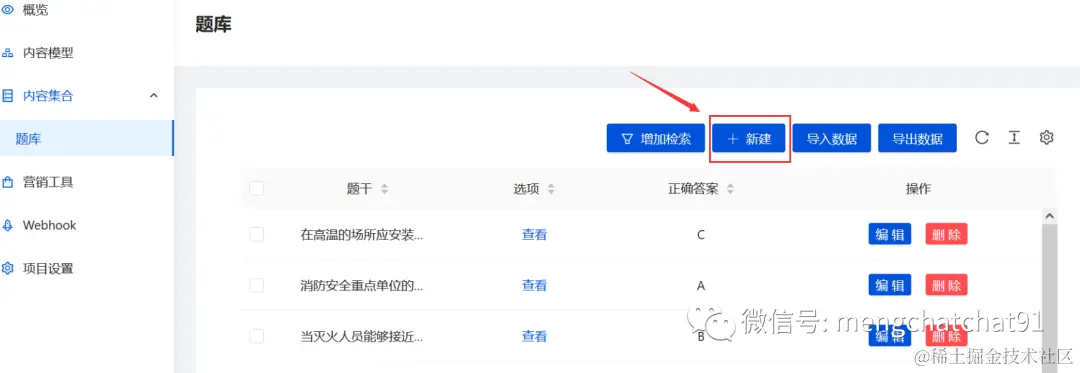 在创建完题库的内容模型后,我们可以点击“内容集合”下的题库菜单,开始管理数据库中的题目数据。我们可以点击新建按钮,添加一个新的题目。