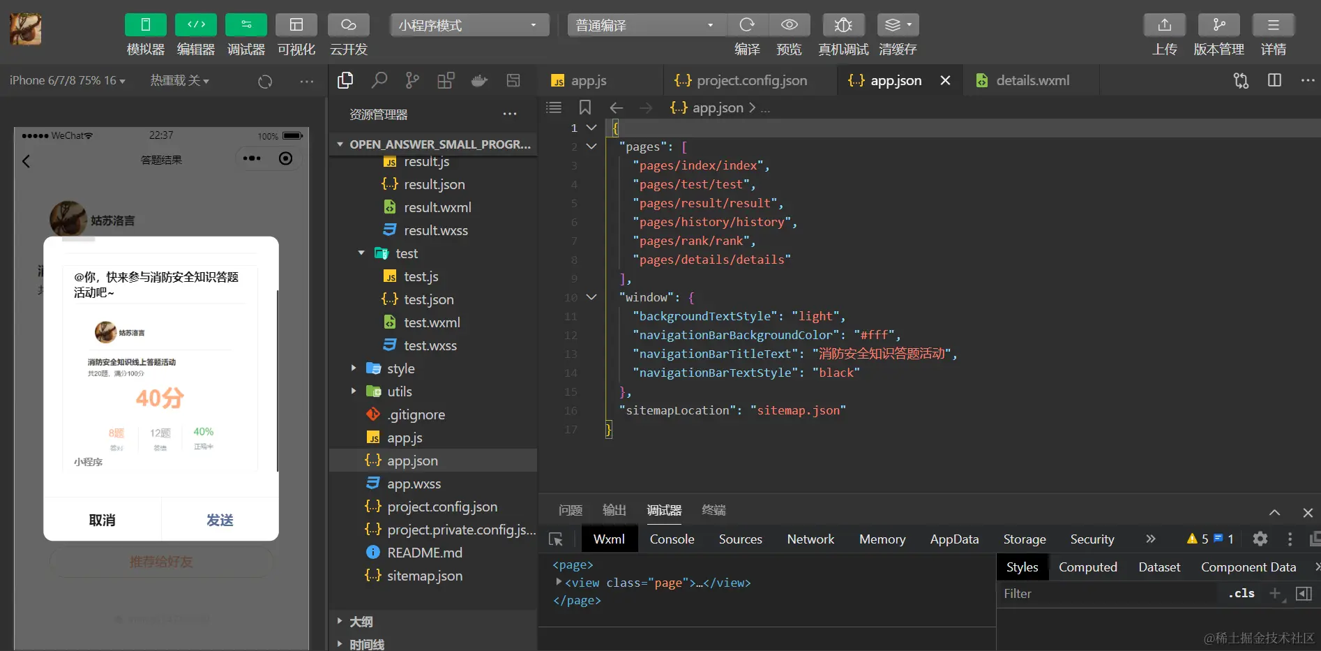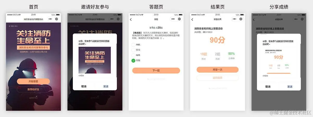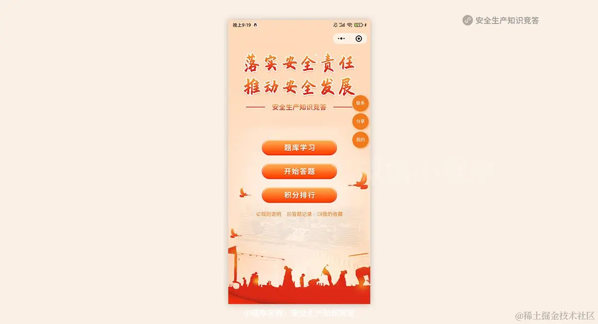 答题活动小程序v3.0,基于微信原生小程序+云开发实现。主要包含六大功能模块页面,首页、答题页、结果页、活动规则页、答题记录页、排行榜页。 适用于交通安全答题、 消防安全知识宣传、 安全生产知识学习、网络安全知识竞赛、五四青年节答题活动、学法普法教育、有奖答题等应用场景。