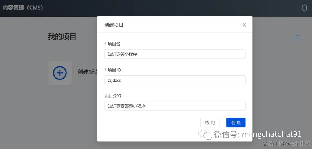 在开始管理内容数据前,需创建一个项目。内容管理使用项目划分不同类的内容,便于区分内容数据用途,进行权限管理。