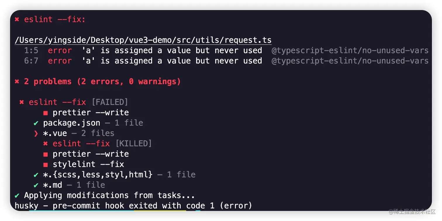 在git commit的时候,之前我们在.eslintrc.cjs中定义为error的项,直接帮我们定义错误,而且帮为了做好了格式化,修复掉这个问题之后,重新执行git add .,再次git commit,这次依然提示错误: