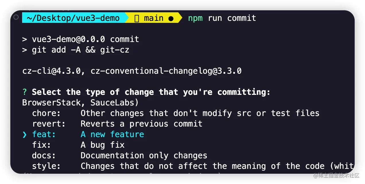 注意:下面的配置只是试验性质,原生的commitizen交互式提示不是太符合国情,大家可以做做试验,后面有其他插件替代