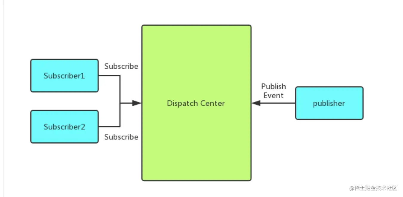 订阅者把自己想订阅的事件注册到调度中心,当该事件触发时候,发布者发布该事件到调度中心(并携带上下文),由调度中心统一调度订阅者注册到调度中心的处理代码。