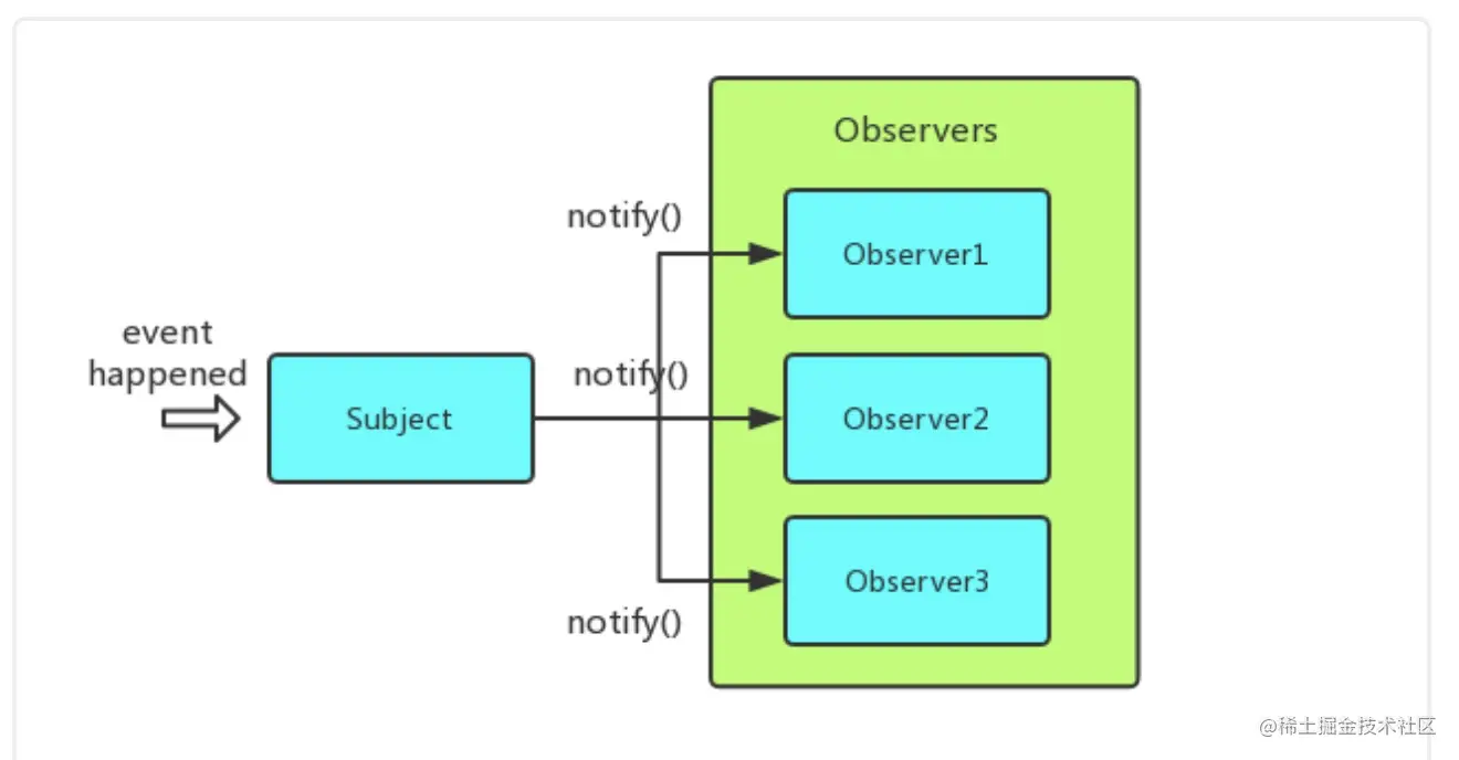 这里的订阅者称为观察者,而被观察者称为发布者,当一个事件发生,发布者会发布通知所有订阅者,并常常以事件对象形式传递消息。