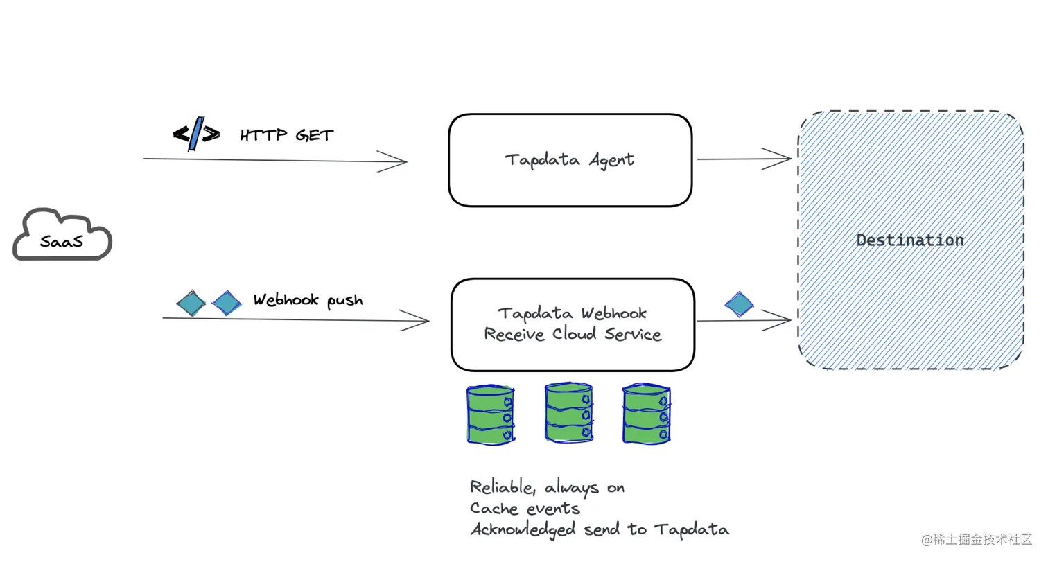 在使用 API 获取数据时,HTTP 请求是非常简单的。但 SaaS 平台往往不希望我们过于频繁地请求数据,因为这会导致服务器过载,最终可能会拒绝服务。因此,SaaS 平台通常采用推送数据的方式,比如 Webhook。然而,使用 Webhook 也存在一定的风险,如果你的服务不可靠,可能会丢失一些事件。为了解决这个问题,Tapdata 针对 SaaS 源提供自研的云上高可用的 Reliable Service,让云上的服务保持在线的同时,源事件也不会丢失,保证了实时数据链路的可靠性。