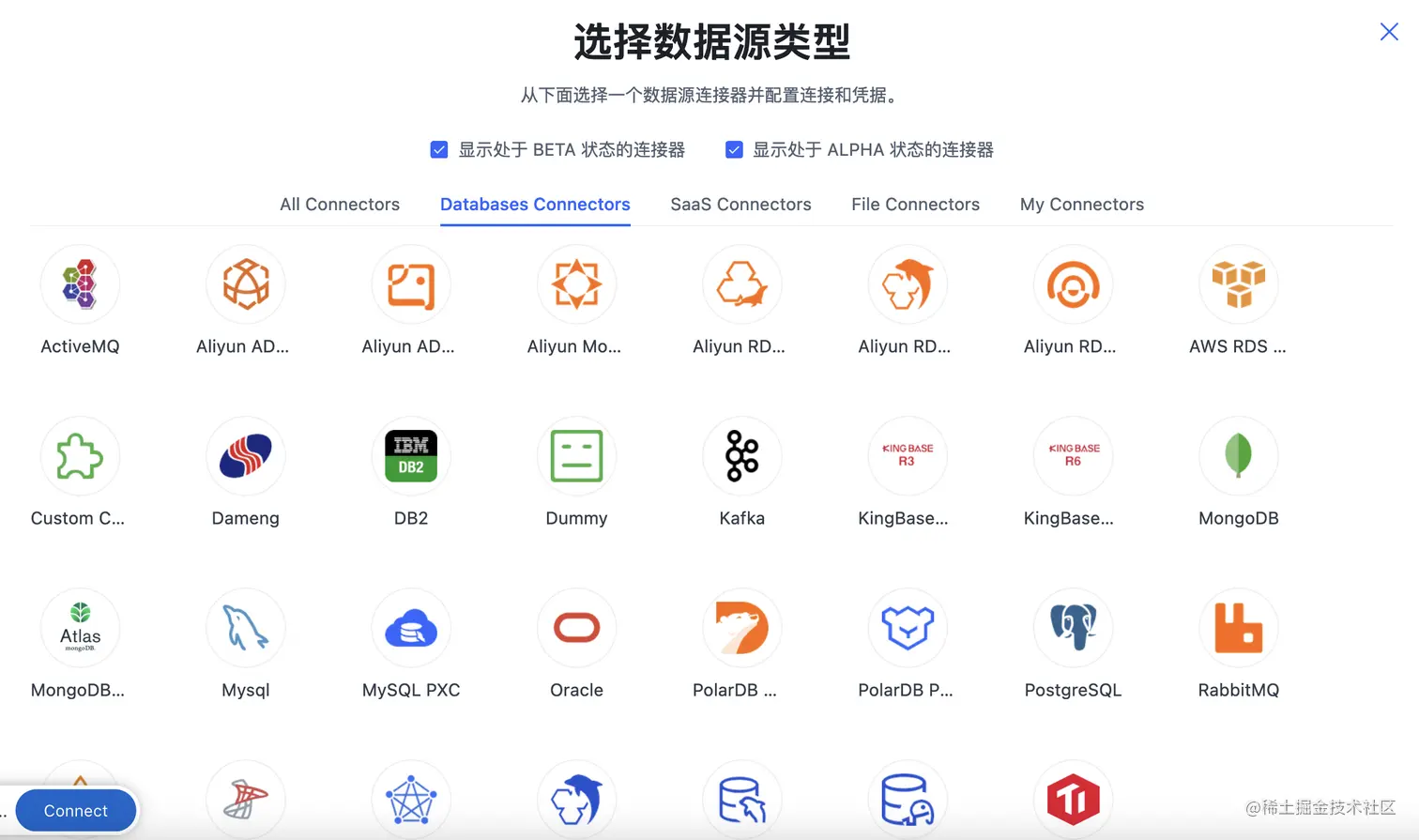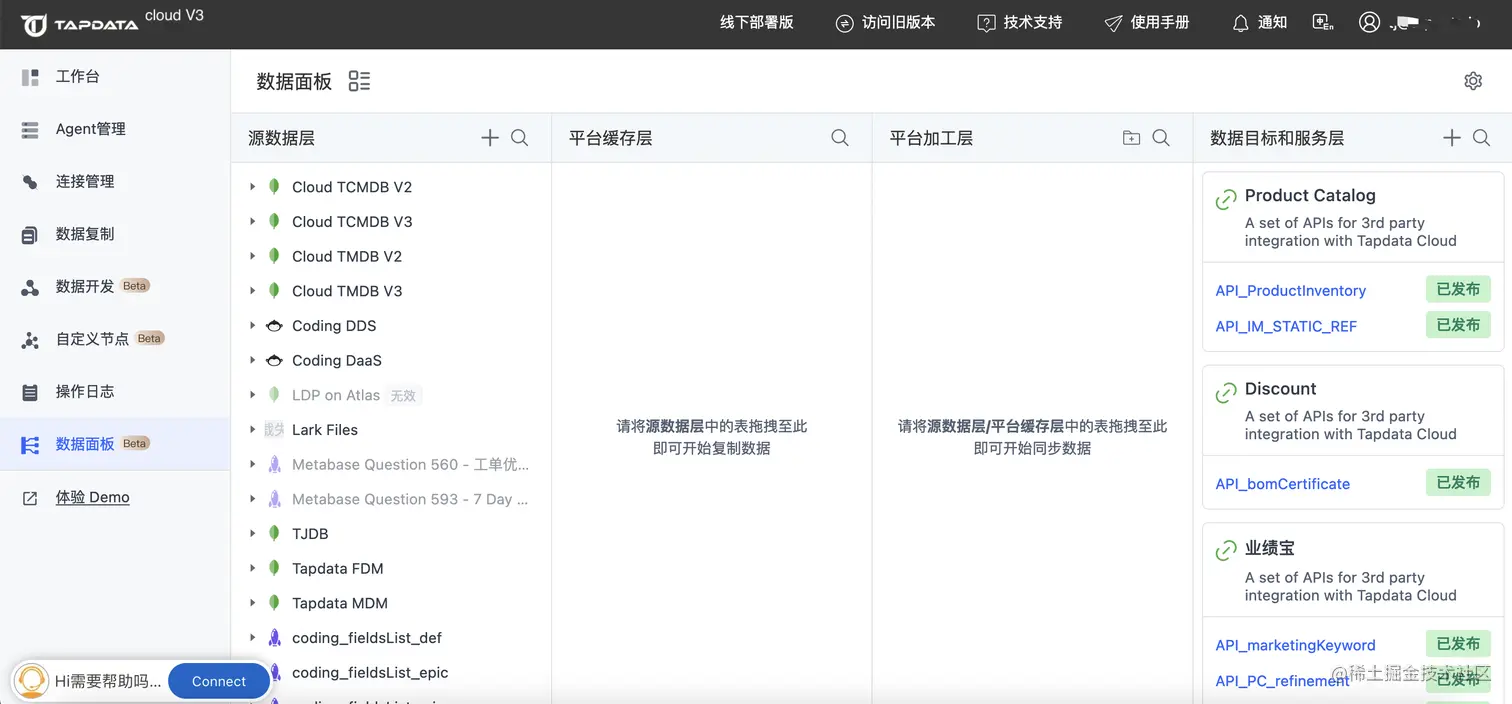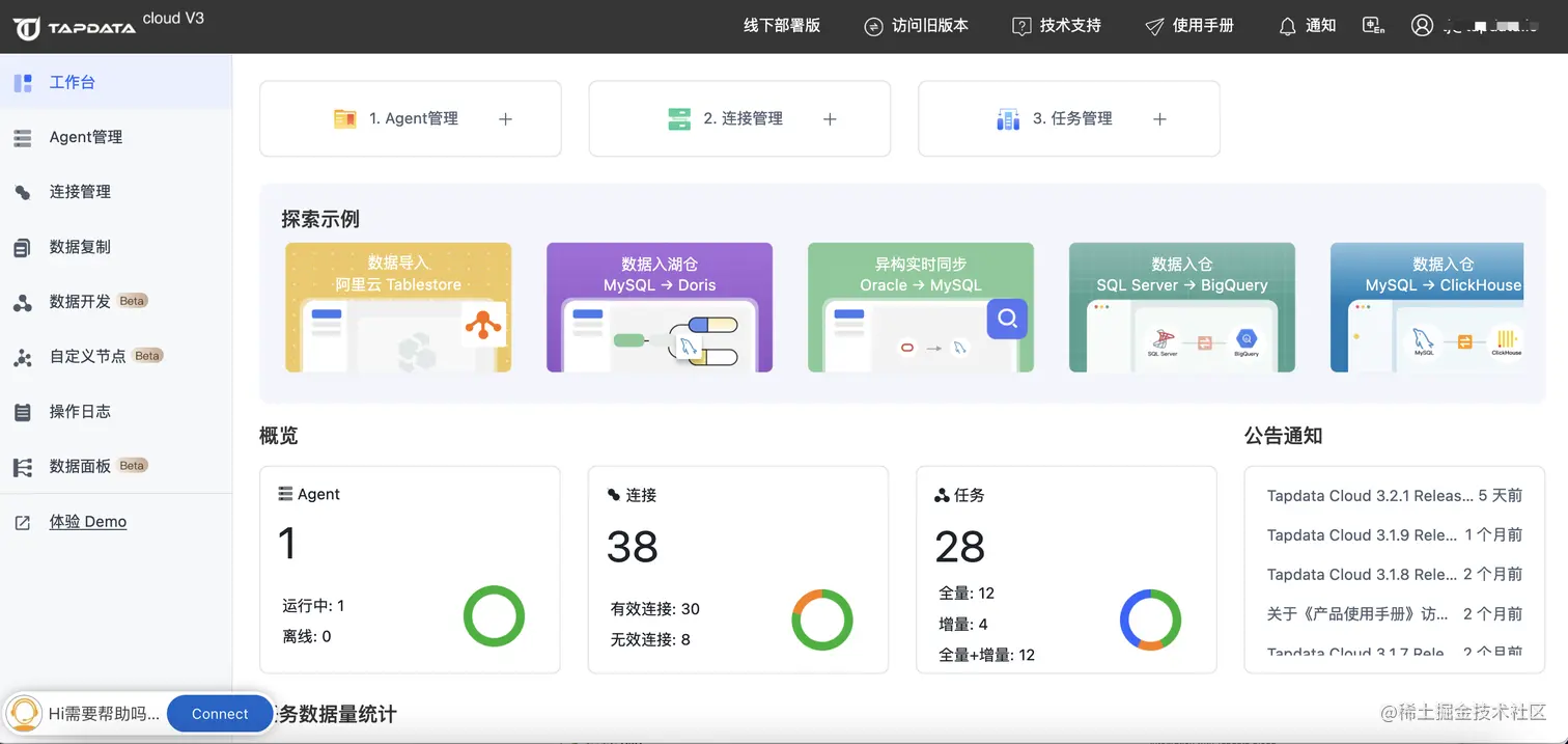 支持以实时的方式从各个数据来源,包括数据库、API、队列、物联网等数据提供者采集或同步最新的数据变化。已内置 100+ 连接器且不断拓展中,覆盖大部分主流的数据库和类型,下一步将着重拓展 SaaS 数据源的接入。此外,还支持自定义数据源,具有强可扩展性的 PDK 架构,4 小时快速对接 SaaS API 系统;16 小时快速对接数据库系统。
